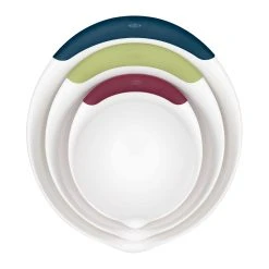 Add some color to your mixing bowl collection with the OXO 3-Piece Mixing Bowl Set with colorful nonslip handles. These plastic mixing bowls include a 5-Quart, 3-Quart, and 1.5-Quart bowl, all with non-slip bottoms to prevent spills while you whip up your favorite treats. Effortlessly combine ingredients between bowls with the easy-pour spouts and one-sided handles. To make storage easy, these compact bowls nest inside each other, giving you more cupboard space. Get this set of versatile mixing bowls today and enjoy making your dinner simpler than ever before.